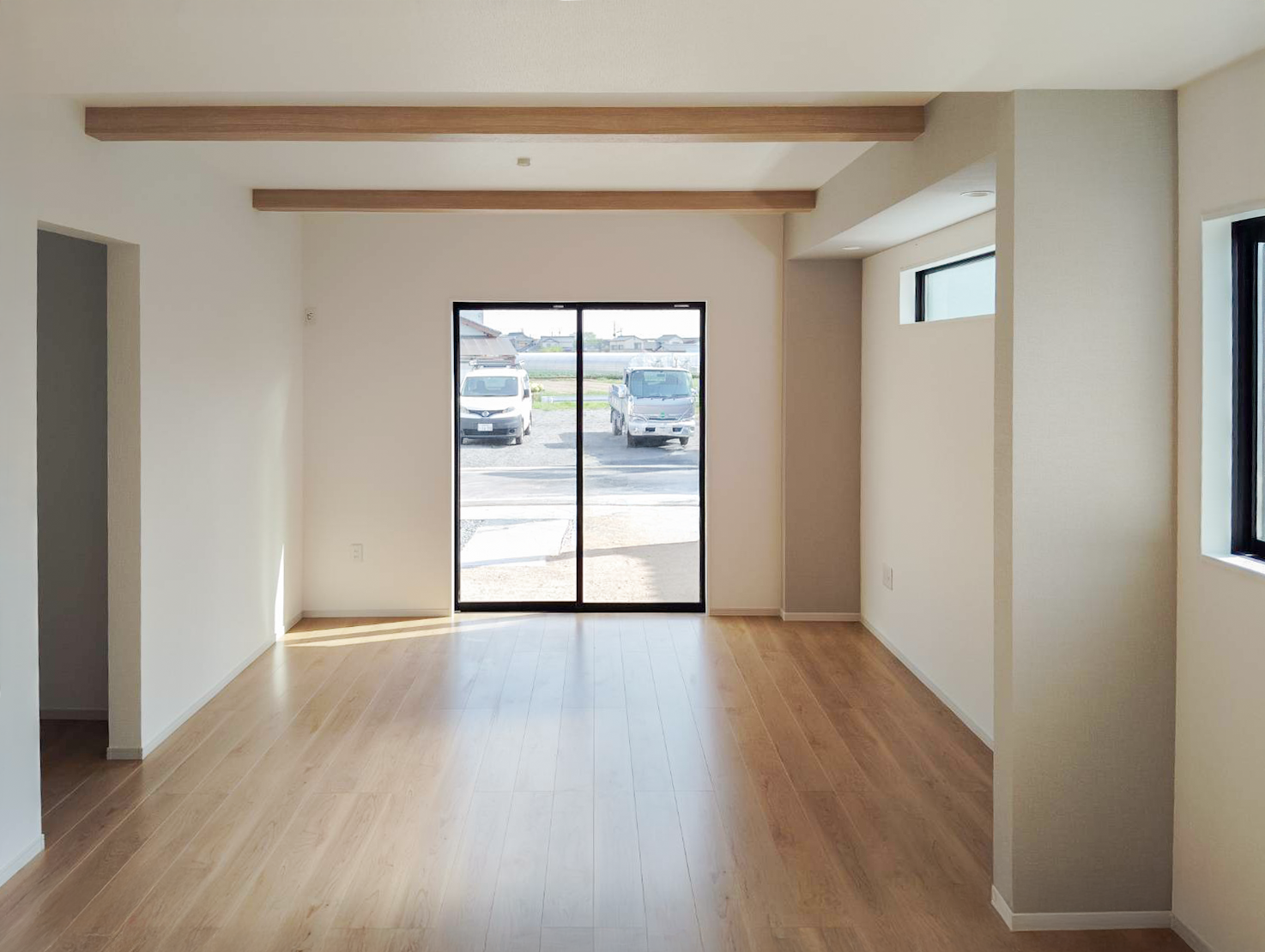 リビングの天井は高さがあるので、ひろびろと感じる♪化粧梁が空間をおしゃれに演出します。