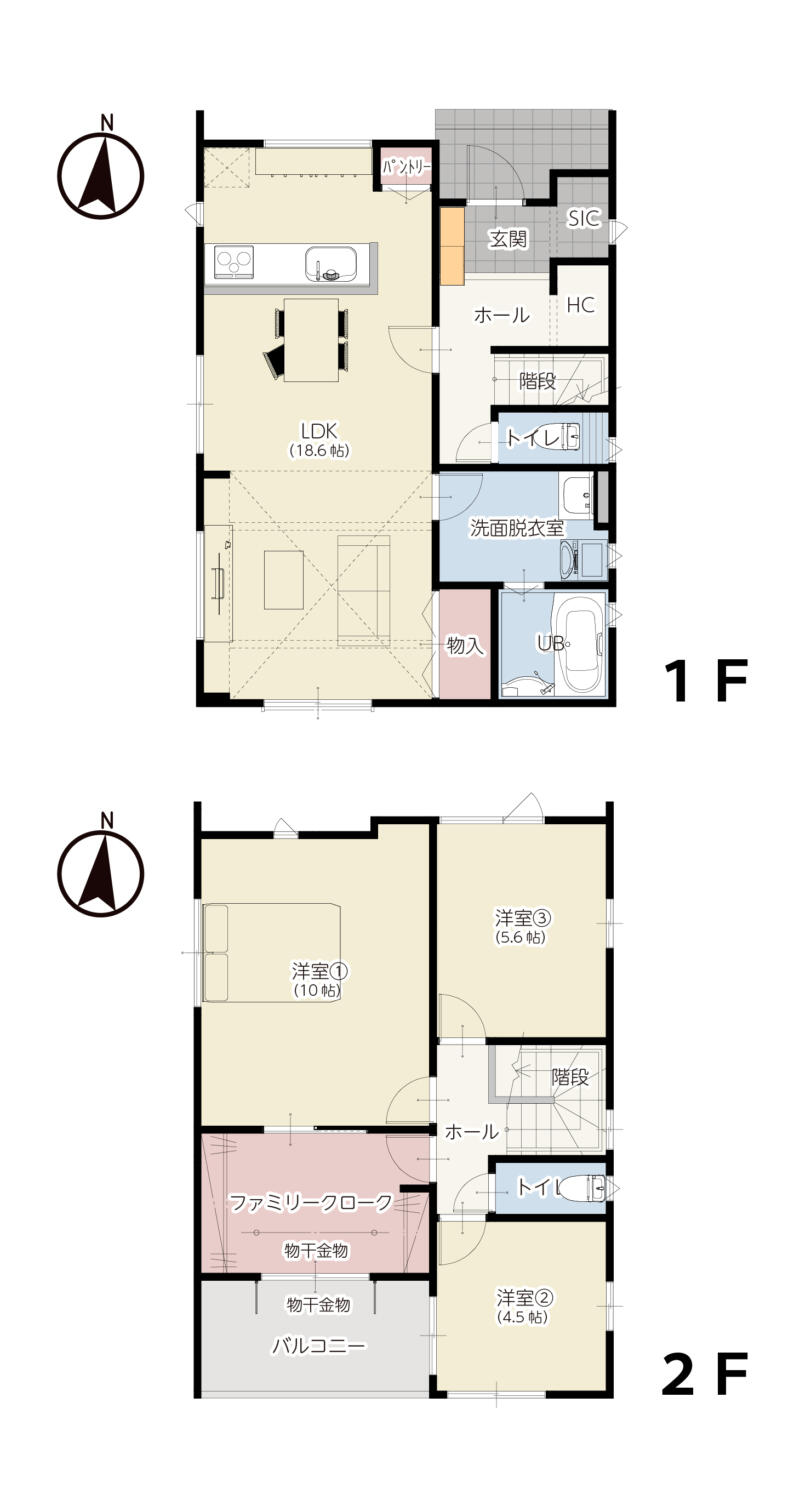 ・2階の大容量ファミリークロークで家族の服をまとめて収納可能。バルコニーで干した洗濯物の収納や室内干しにも便利です。