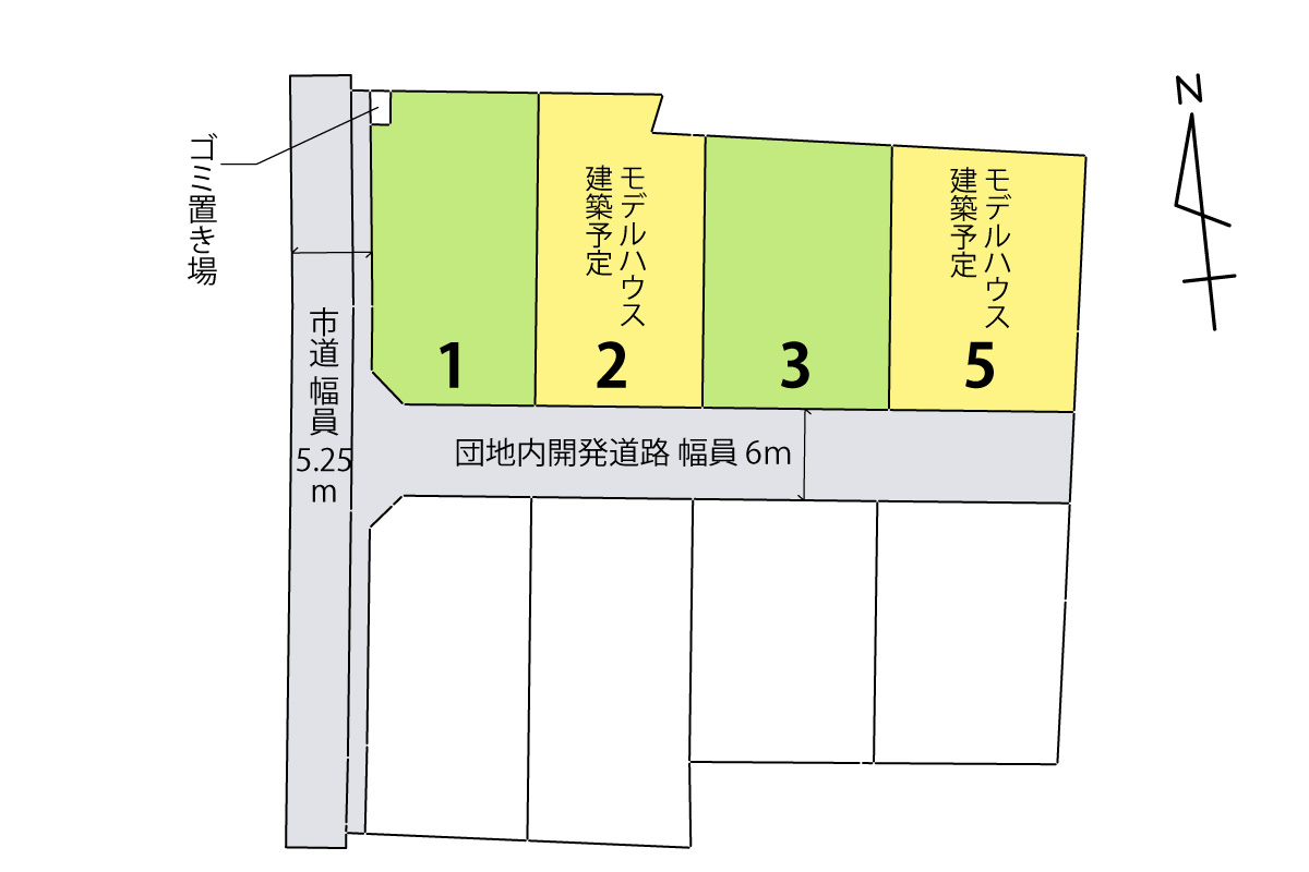 全区画60坪以上を確保。駐車スペースやお庭もしっかり取れるゆとりの広さです。団地内道路6mあり、車の出し入れもスムーズです。