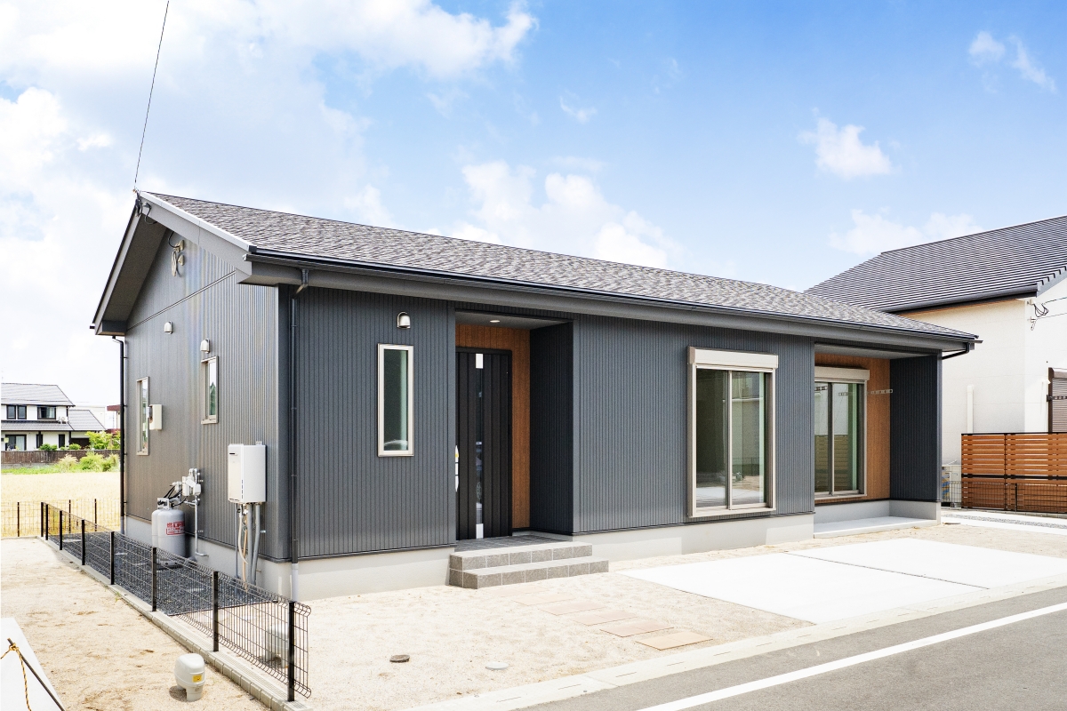 ・すっきりとした外観の平屋住宅。おしゃれなツートンの外壁でメリハリのあるデザイン。