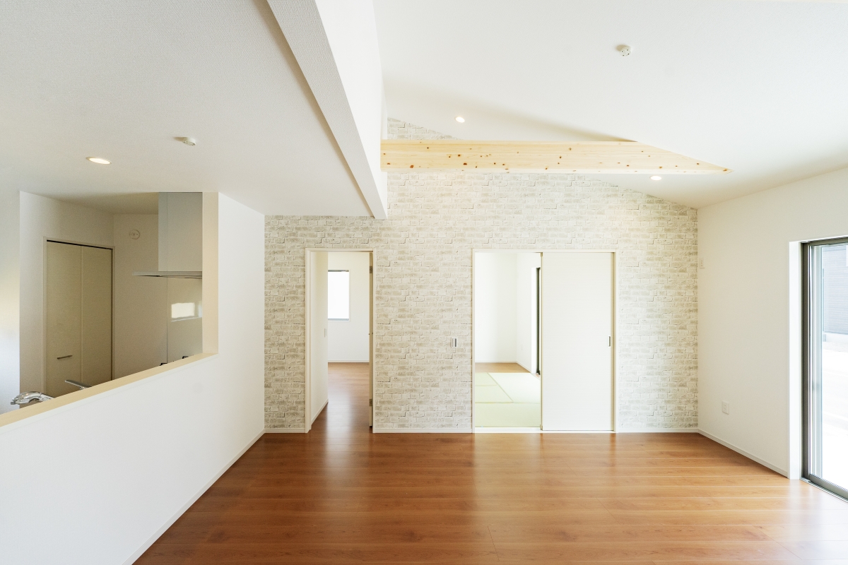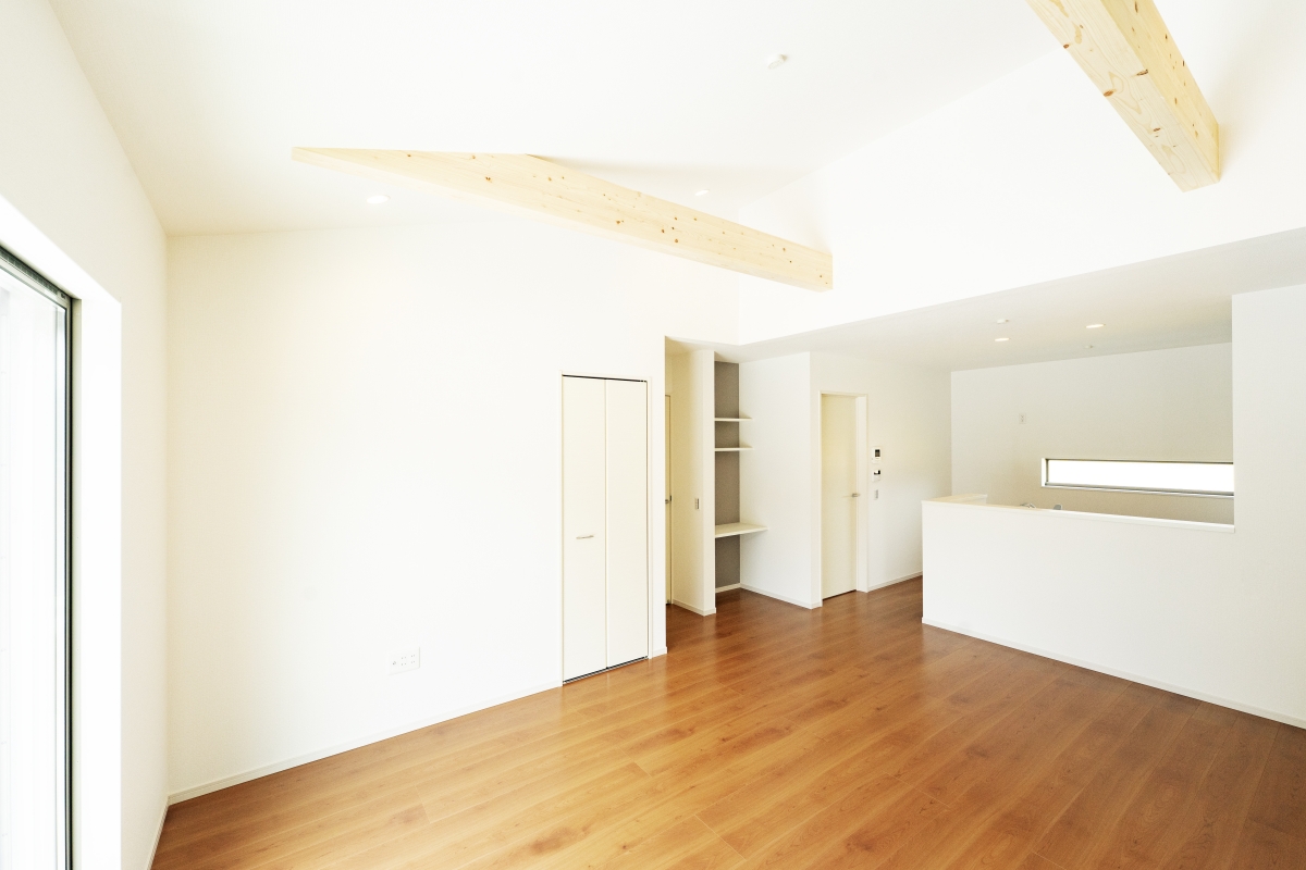 勾配天井で圧迫感のないLDK。空間が高いので、帖数以上に広く感じる開放的な空間です。