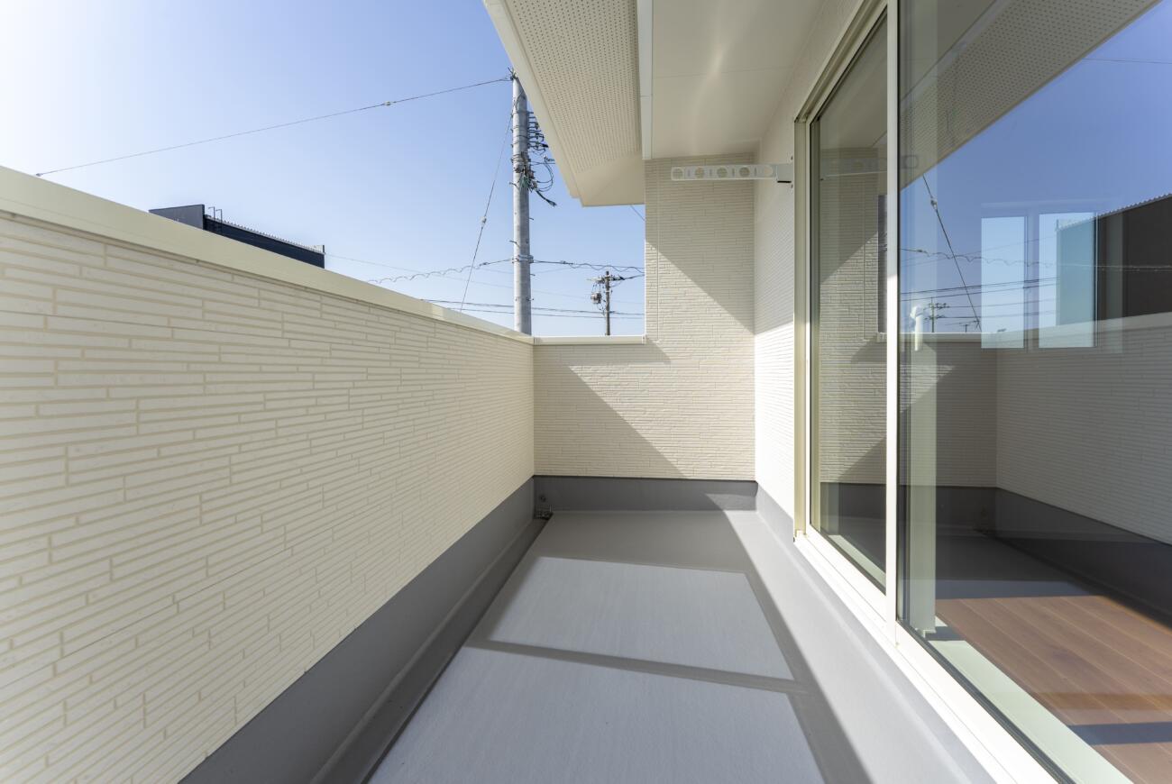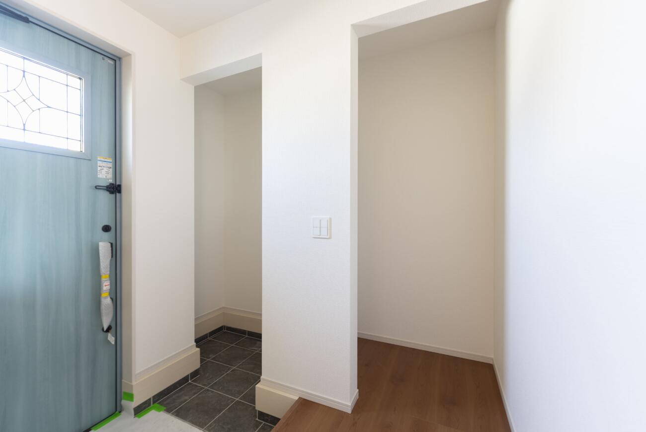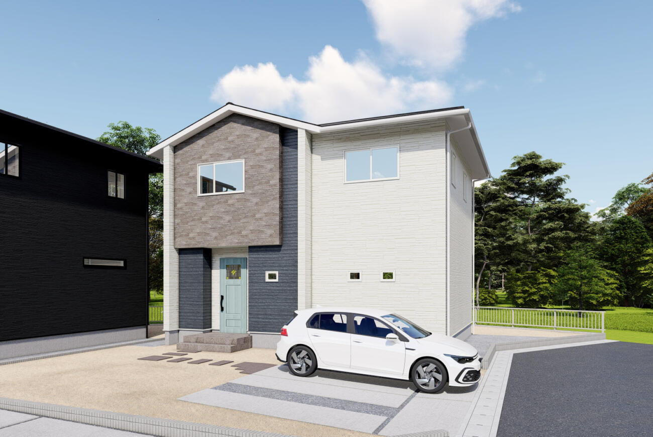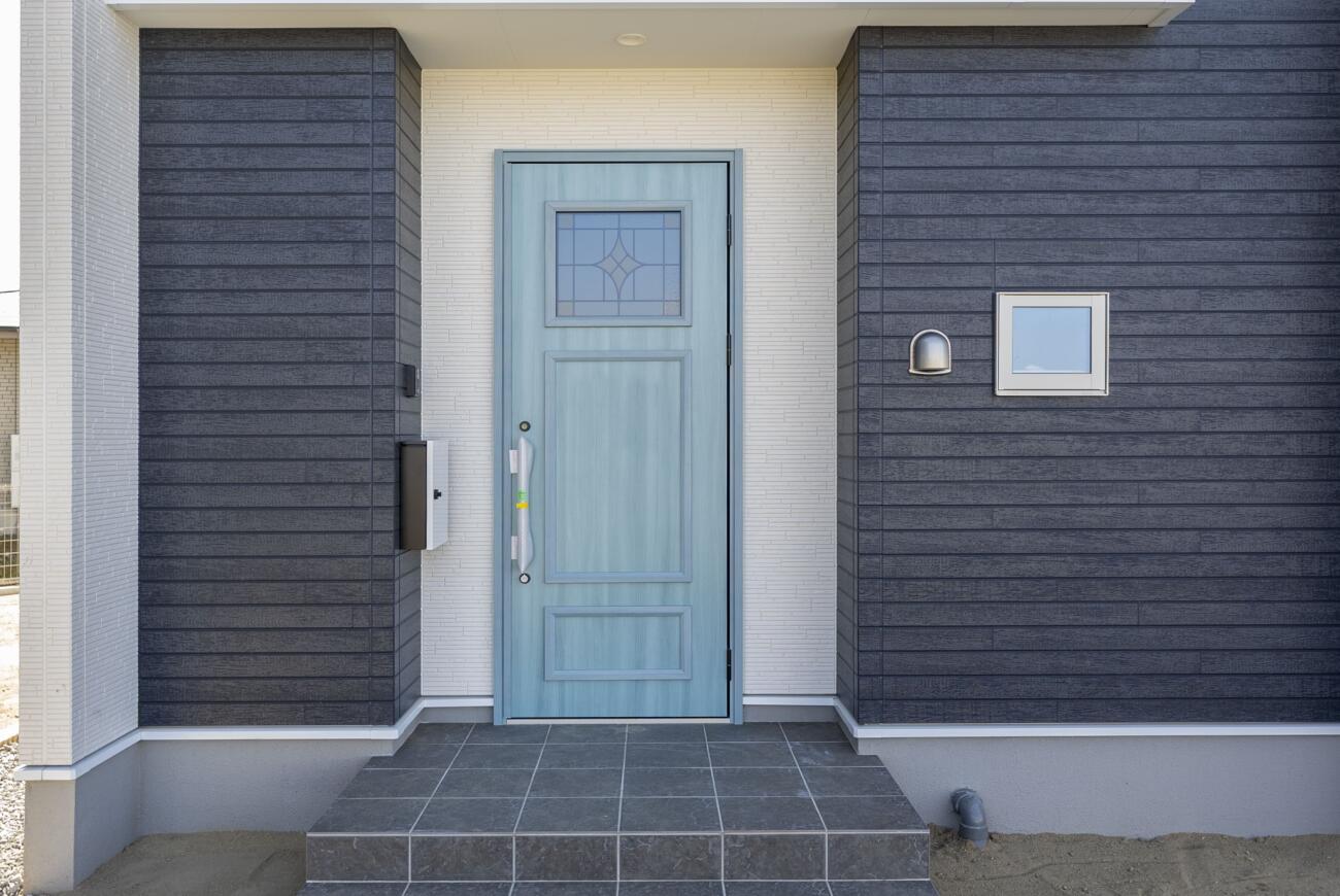 ✅ 一目惚れする「淡いブルーのドア」 🚪 白を基調とした外壁に、優しいペールブルーの玄関ドアがアクセント。 毎日家に帰るのが楽しみになる、絵本のような可愛らしいデザインです。