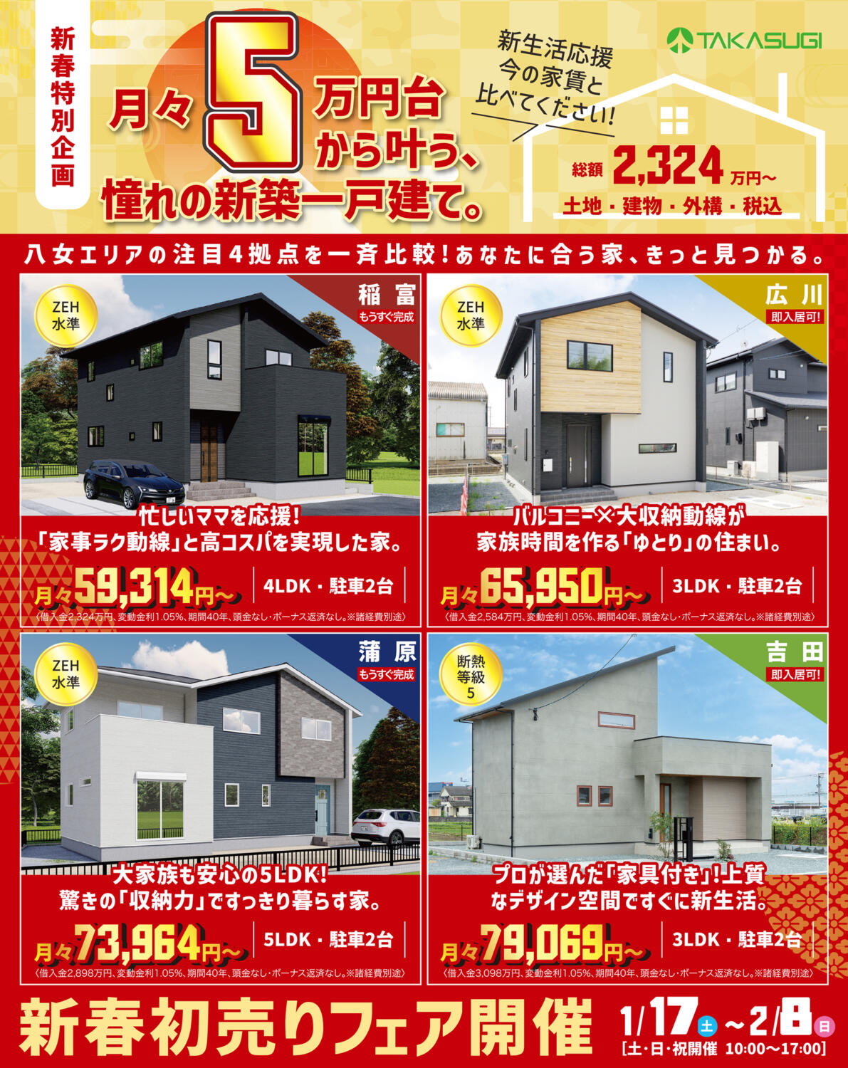 「家事ラク」「5LDK」「家具付き」など、異なる4つのスタイルを一度に見比べられるチャンスです。