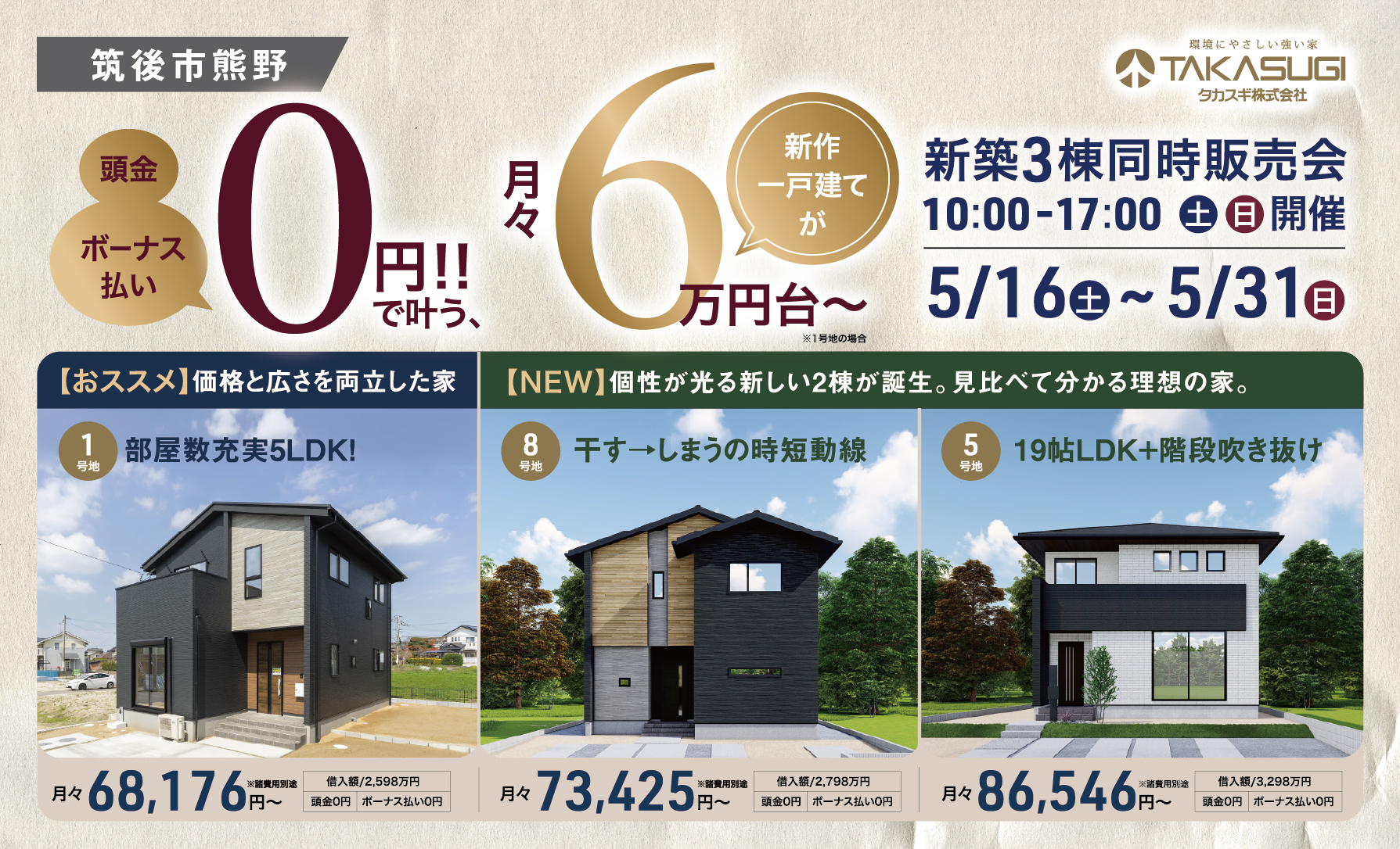 筑後市熊野(ちくごテラス熊野II団地)にて、新作一戸建てを含む新築3棟の同時見学販売会を開催いたします。
