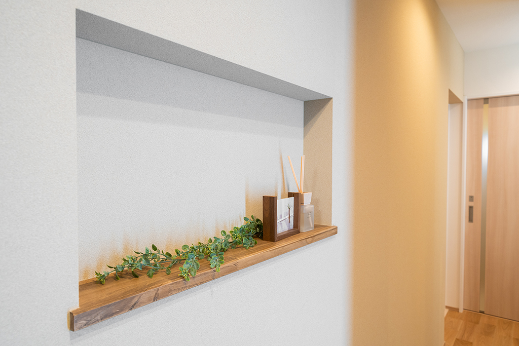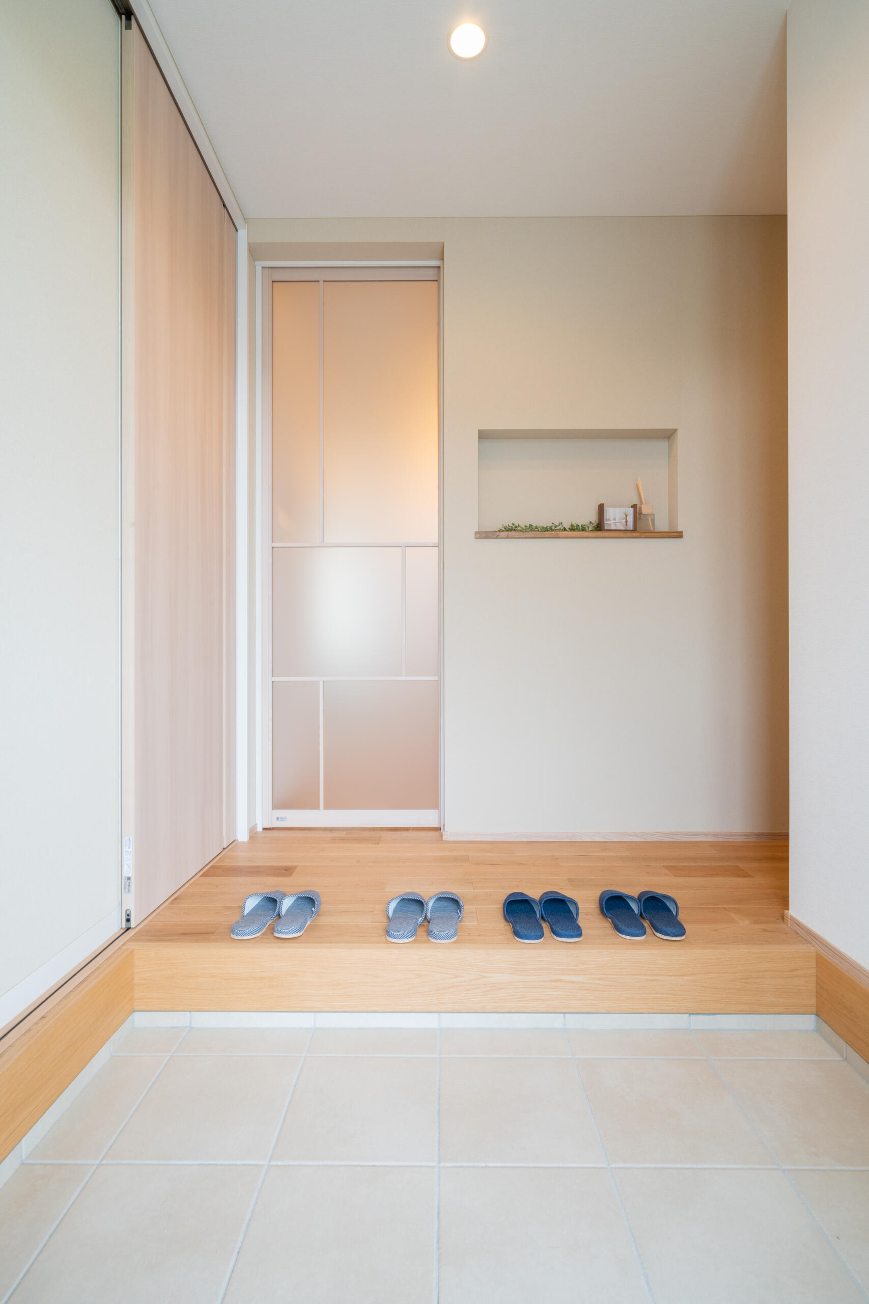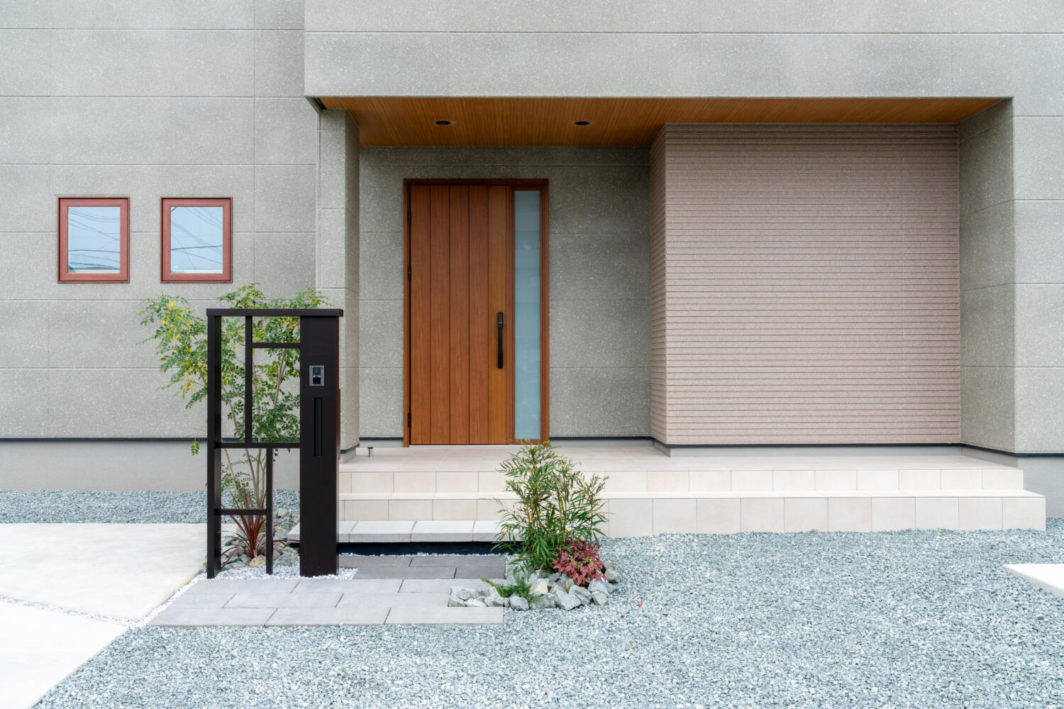 木調の優しい玄関ドア。インターホンやアプローチ、植栽にもこだわったデザイン。