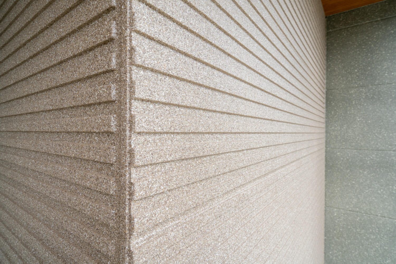 意匠性のある外壁。厚さ37㎜の防音性・耐久性のあるパワーボードを使用。