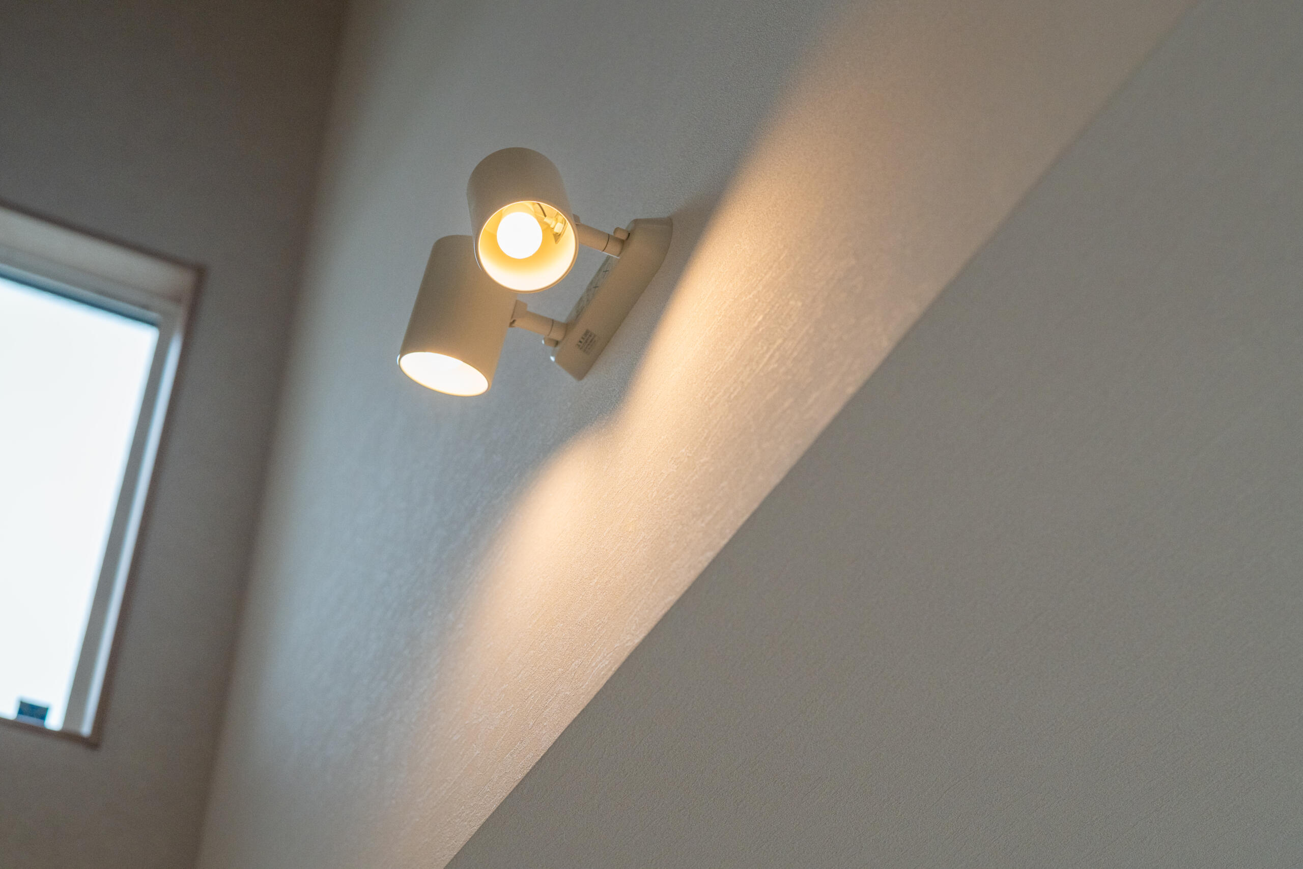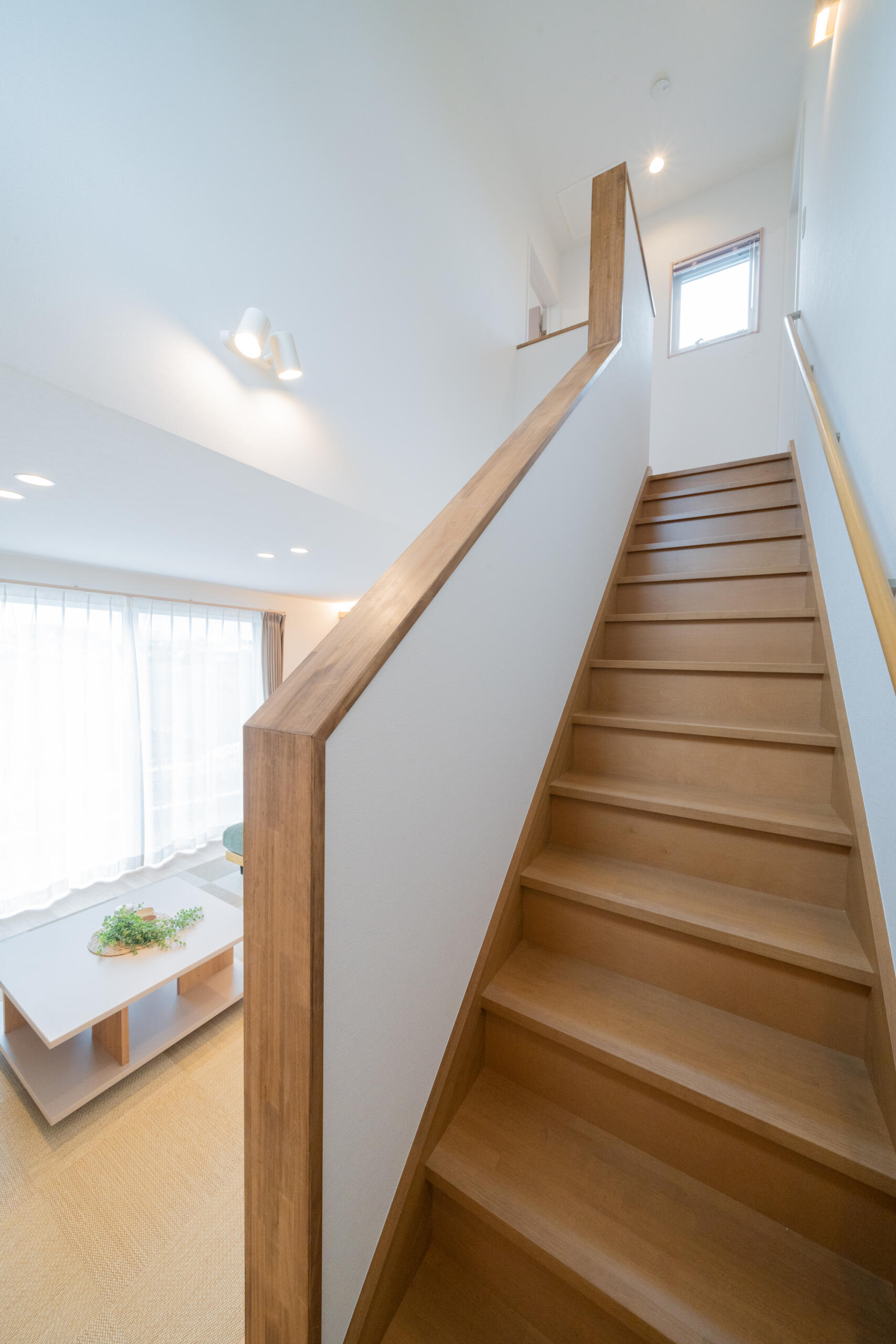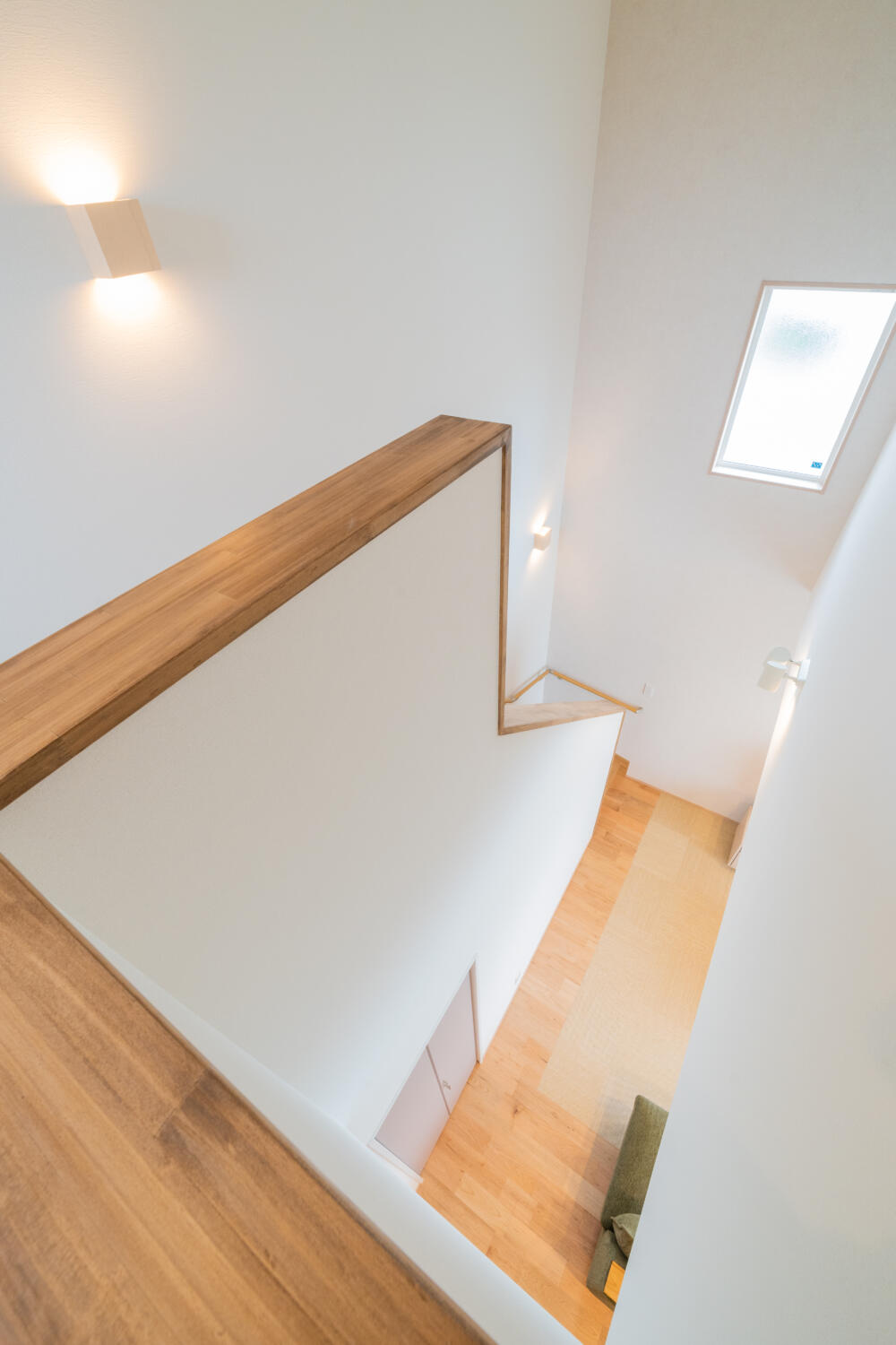 吹き抜けの階段。高窓からの光で明るく開放感があります。