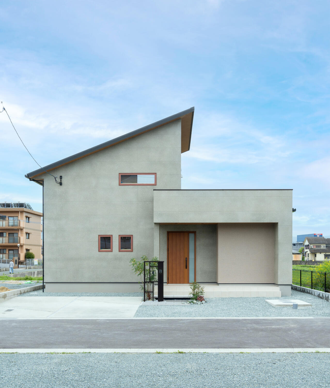 デザイン性の高いアシンメトリーの外観。グレーの落ち着いたモダンな配色。