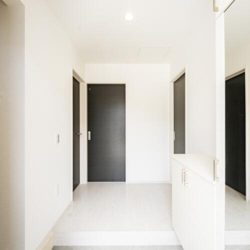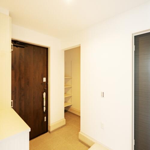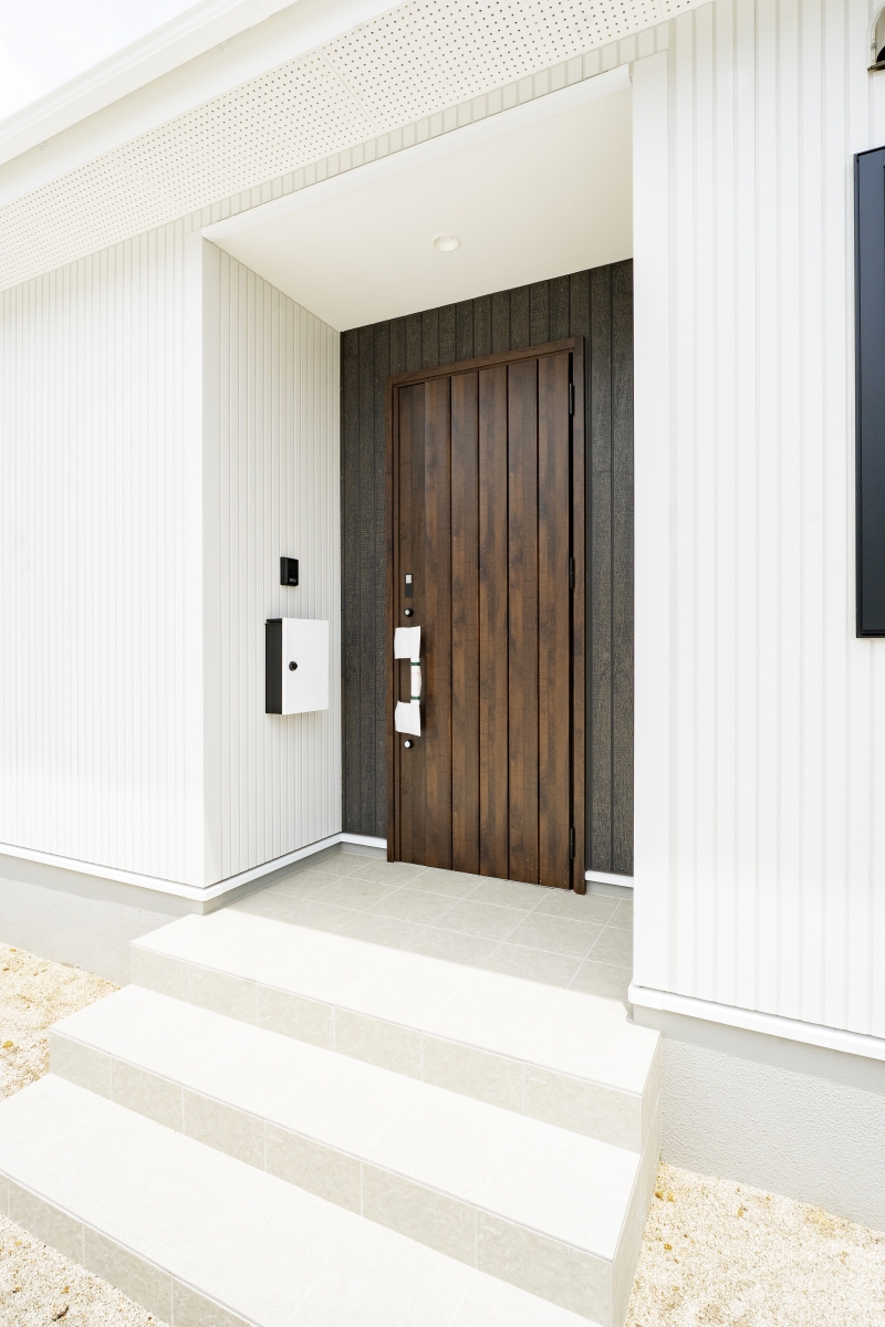 玄関ドアは重厚なダークブラウンの木調デザイン。インターホン・ポストも出入口にすっきりまとまっています。