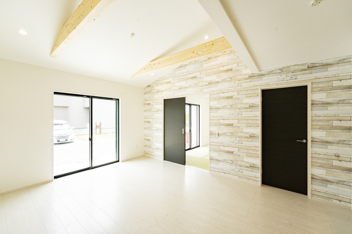 デザイン性のあるアクセントクロスに、勾配天井と梁見せで広い空間を演出。コンパクトでも狭さを感じさせない設計。