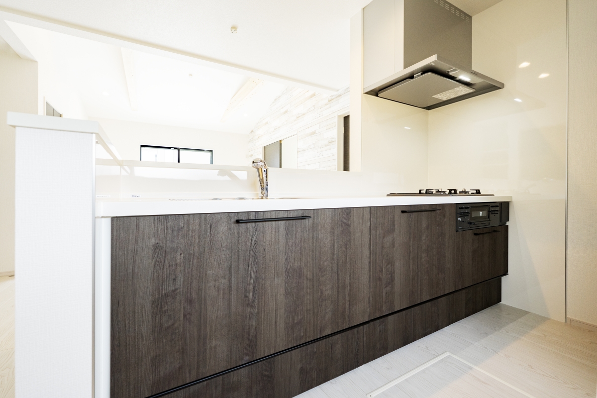落ち着きのあるキッチン。手元を隠しながらリビングを見渡せる、セミオープンキッチン。