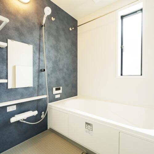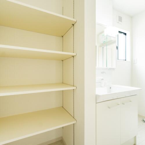 脱衣室には可動式の棚付き。タオルや着替えをすっきりと収納できます。窓付きで換気と採光もばっちりです。