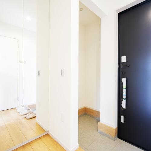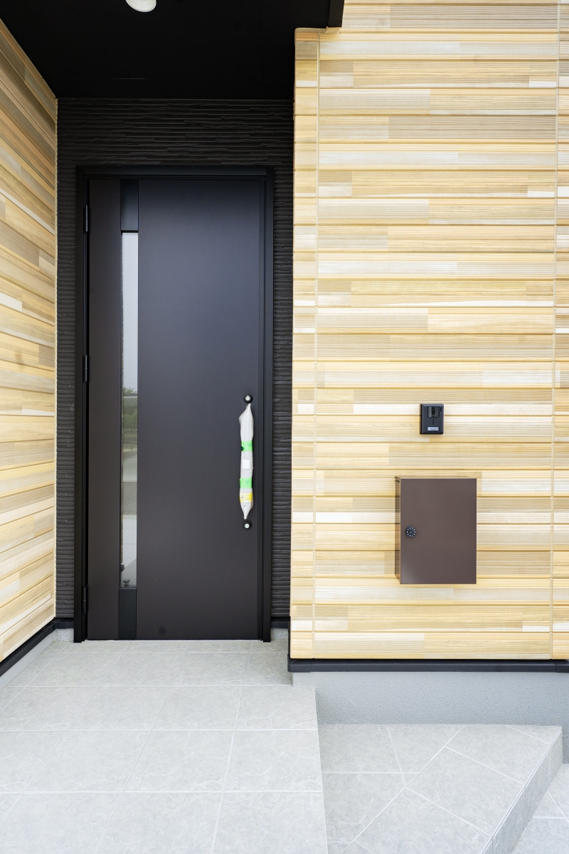 帰宅時に玄関が明るいガラス窓付きのドア。ポストやインターホンも玄関まわりにすっきりまとめています。