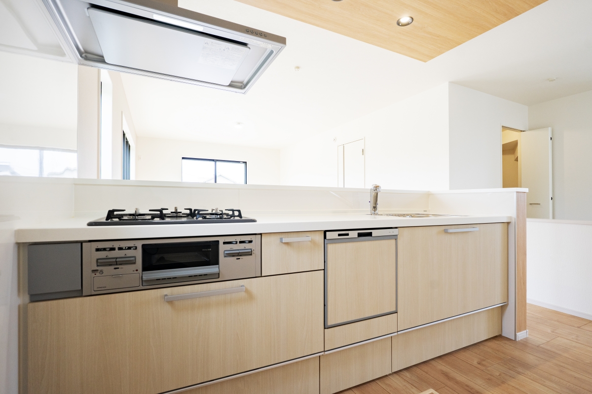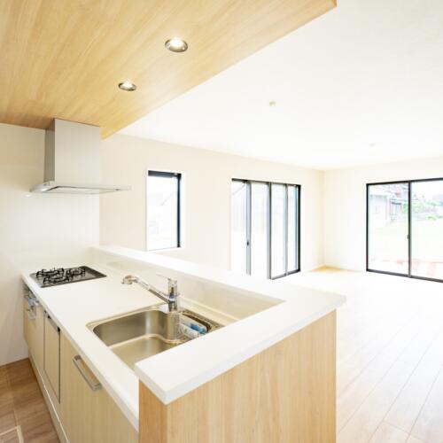 手元を隠せるキッチンで、来客時の目線も気にならない。おり下げ天井が空間をおしゃれに演出します。